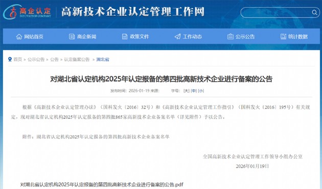 近日,全国高新技术企业认定管理工作领导小组办公室正式发布《对湖北省认定机构2025年认定报备的第四批高新技术企业进行备案的公