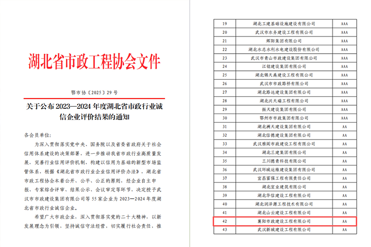 12月29日,湖北省市政工程协会发布《关于公布2023—2024年度湖北省市政行业诚信企业评价结果的通知》(鄂市协〔2025〕29号),汉江城建子公司市政公司凭借规范的经营管理、扎实的履约能力和良好的社会责任口碑,获评“湖北省市政行业AA级诚信企业”。