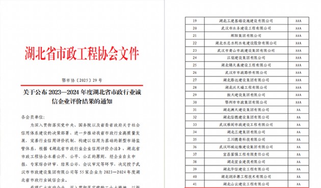 12月29日,湖北省市政工程协会发布《关于公布2023—2024年度湖北省市政行业诚信企业评价结果的通知》(鄂市协〔2025〕29号)