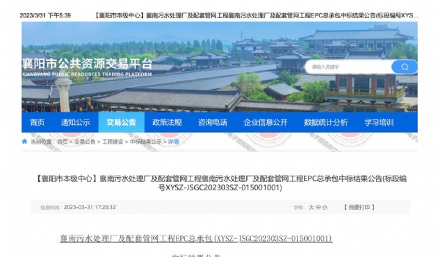 3月31日,汉江城建牵头中标襄南污水处理厂及配套管网工程EPC总承包项目(以下称本项目),中标金额44164.88万元,建设工期2年。本